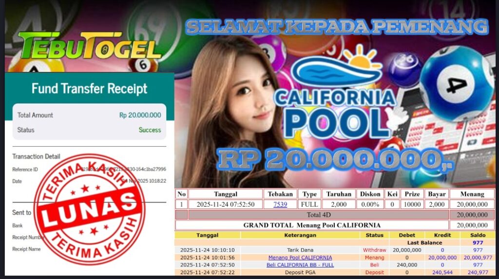 Selamat kepada User id : NUTS00*** telah berhasil mendapatkan kemenangan besar pada permainan TOGEL CALIFORNIA dengan kemenangan sebesar Rp 20.000.000,-… Baca selengkapnya...