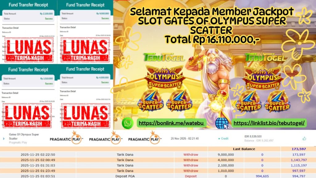 Selamat kepada User id : LOLOS** telah berhasil mendapatkan kemenangan besar pada permainan SLOT GATES OF OLYMPUS SUPER SCATTER dengan … Baca selengkapnya...