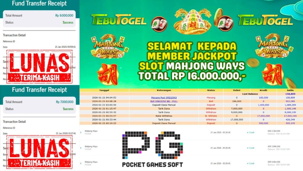 Selamat kepada User id : CAPR*** telah berhasil mendapatkan kemenangan besar pada permainan SLOT MAHJONG WAYS dengan kemenangan sebesar Rp 16.000.000,- Setelah mengisi formulir withdraw dengan kurung waktu hanya 5 – 10 menit pihak TebuTogel sudah melakukan transfer kepada pemilik User id dan dana sudah dapat dicairkan oleh pemenang. Bukti pembayaran yang kami berikan merupakan bukti pembayaran yang SAH / VALID yang langung didapatkan melalui tanda transfer transaksi dari Bank yang dituju.
