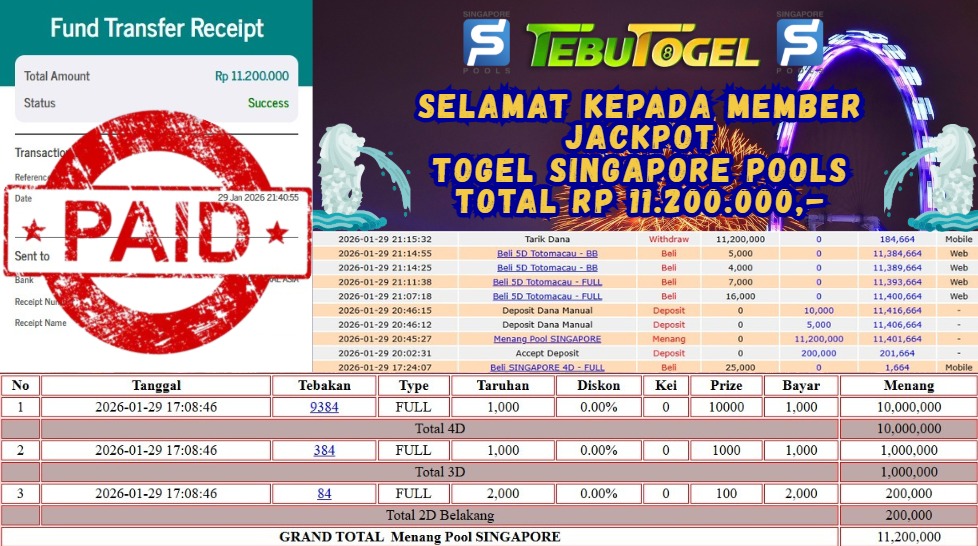 Selamat kepada User id : RZIOP** telah berhasil mendapatkan kemenangan besar pada permainan TOGEL SINGAPORE POOLS dengan kemenangan sebesar Rp 11.200.000,- Setelah mengisi formulir withdraw dengan kurung waktu hanya 5 – 10 menit pihak TebuTogel sudah melakukan transfer kepada pemilik User id dan dana sudah dapat dicairkan oleh pemenang. Bukti pembayaran yang kami berikan merupakan bukti pembayaran yang SAH / VALID yang langung didapatkan melalui tanda transfer transaksi dari Bank yang dituju.