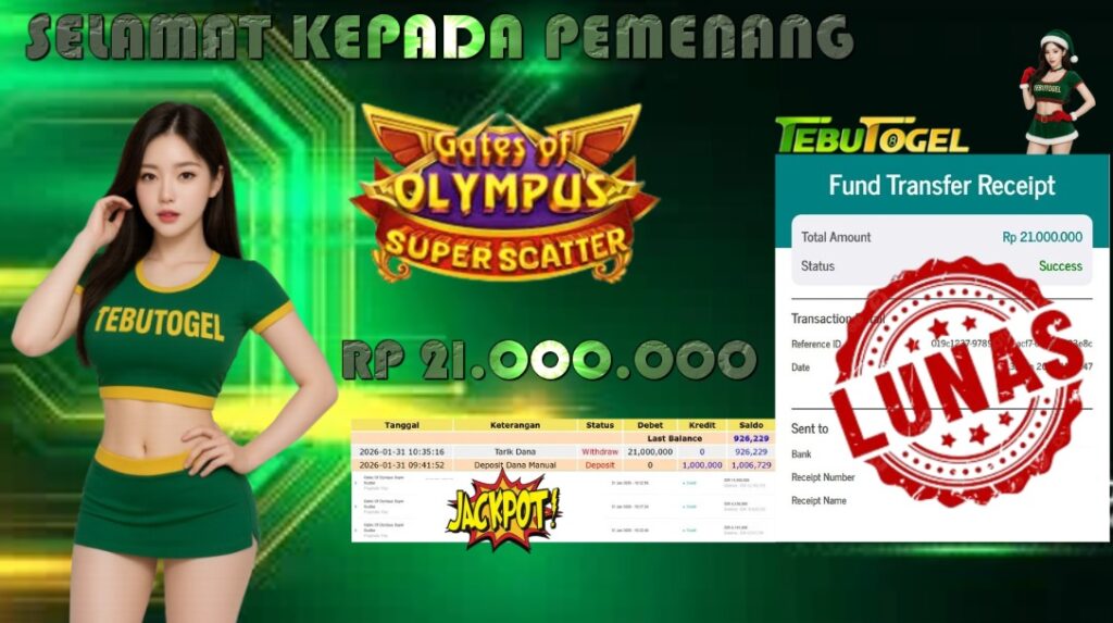 Selamat kepada User id : MNITAE*** telah berhasil mendapatkan kemenangan besar pada permainan SLOT GATES OF OLYMPUS SUPER SCATTER dengan kemenangan sebesar Rp 21.000.000,- Setelah mengisi formulir withdraw dengan kurung waktu hanya 5 – 10 menit pihak TebuTogel sudah melakukan transfer kepada pemilik User id dan dana sudah dapat dicairkan oleh pemenang. Bukti pembayaran yang kami berikan merupakan bukti pembayaran yang SAH / VALID yang langung didapatkan melalui tanda transfer transaksi dari Bank yang dituju.