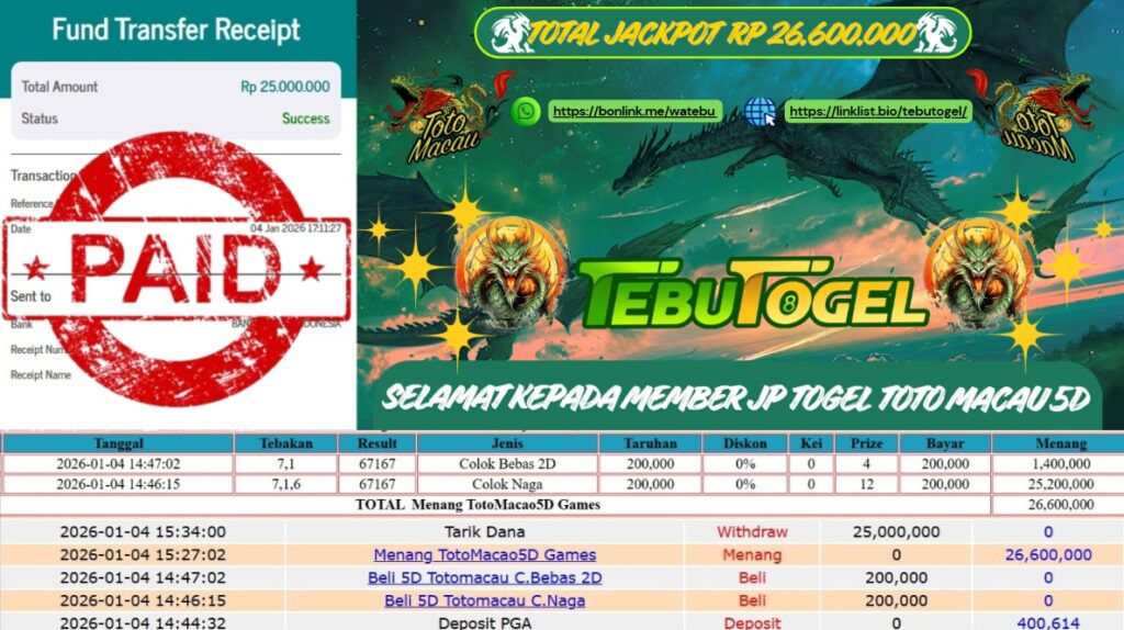 BUKTI JACKPOT TOTO MACAU 5D Rp 12.000.000,- LUNAS