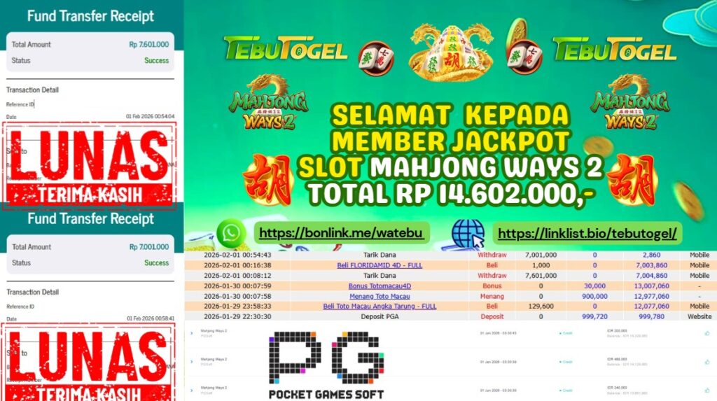 Selamat kepada User id : TORIQ*** telah berhasil mendapatkan kemenangan besar pada permainan SLOT MAHJONG WAYS 2 dengan kemenangan sebesar Rp 14.602.000,- Setelah mengisi formulir withdraw dengan kurung waktu hanya 5 – 10 menit pihak TebuTogel sudah melakukan transfer kepada pemilik User id dan dana sudah dapat dicairkan oleh pemenang. Bukti pembayaran yang kami berikan merupakan bukti pembayaran yang SAH / VALID yang langung didapatkan melalui tanda transfer transaksi dari Bank yang dituju.