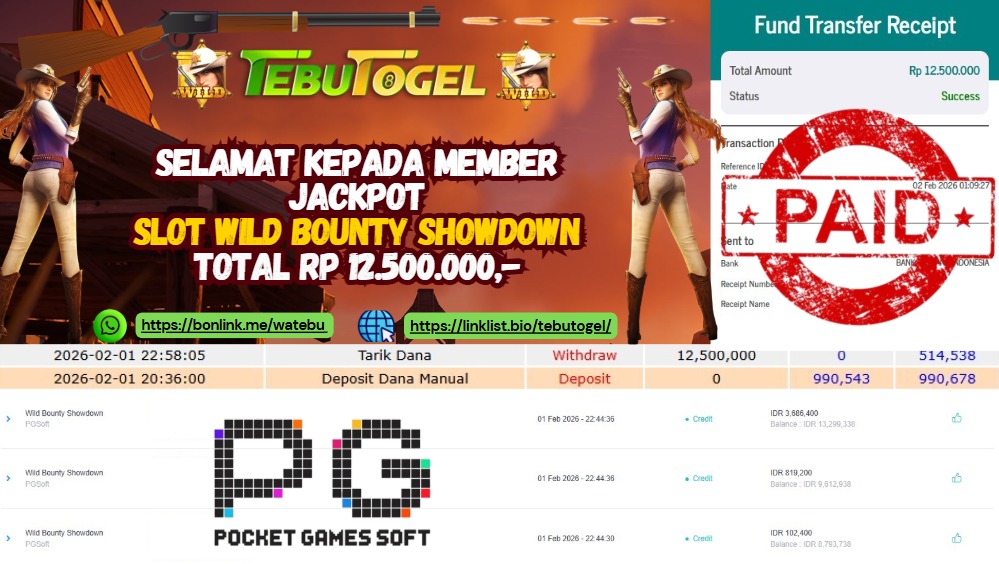 Selamat kepada User id : SUKOCO** telah berhasil mendapatkan kemenangan besar pada permainan SLOT WILD BOUNTY SHOWDOWN dengan kemenangan sebesar Rp 12.500.000,- Setelah mengisi formulir withdraw dengan kurung waktu hanya 5 – 10 menit pihak TebuTogel sudah melakukan transfer kepada pemilik User id dan dana sudah dapat dicairkan oleh pemenang. Bukti pembayaran yang kami berikan merupakan bukti pembayaran yang SAH / VALID yang langung didapatkan melalui tanda transfer transaksi dari Bank yang dituju.