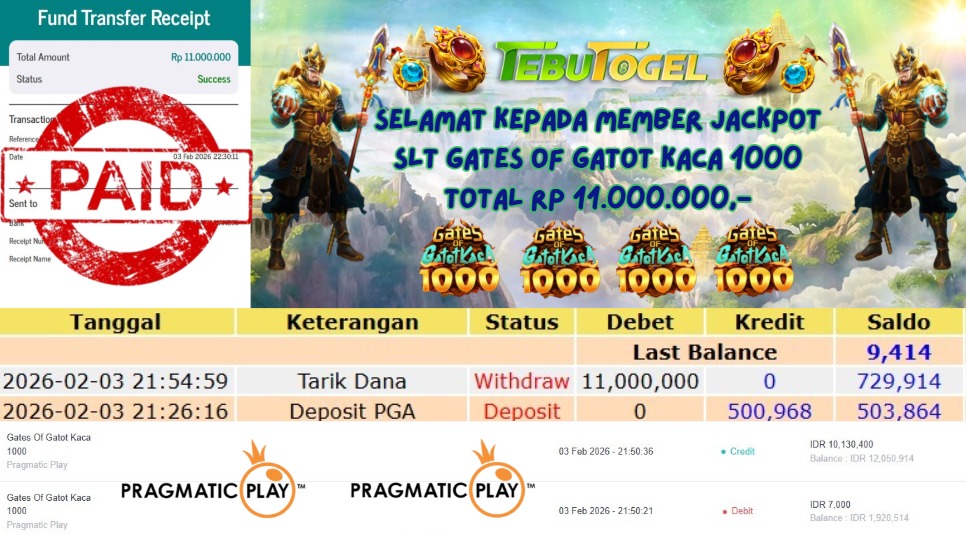 Selamat kepada User id : NOBI** telah berhasil mendapatkan kemenangan besar pada permainan SLOT GATES OF GATOT KACA 1000 dengan kemenangan sebesar Rp 11.000.000,- Setelah mengisi formulir withdraw dengan kurung waktu hanya 5 – 10 menit pihak TebuTogel sudah melakukan transfer kepada pemilik User id dan dana sudah dapat dicairkan oleh pemenang. Bukti pembayaran yang kami berikan merupakan bukti pembayaran yang SAH / VALID yang langung didapatkan melalui tanda transfer transaksi dari Bank yang dituju.