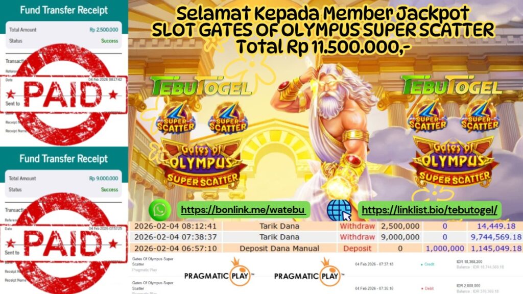 Selamat kepada User id : SISKA** telah berhasil mendapatkan kemenangan besar pada permainan SLOT GATES OF OLYMPUS SUPER SCATTER dengan kemenangan sebesar Rp 11.500.000,- Setelah mengisi formulir withdraw dengan kurung waktu hanya 5 – 10 menit pihak TebuTogel sudah melakukan transfer kepada pemilik User id dan dana sudah dapat dicairkan oleh pemenang. Bukti pembayaran yang kami berikan merupakan bukti pembayaran yang SAH / VALID yang langung didapatkan melalui tanda transfer transaksi dari Bank yang dituju.