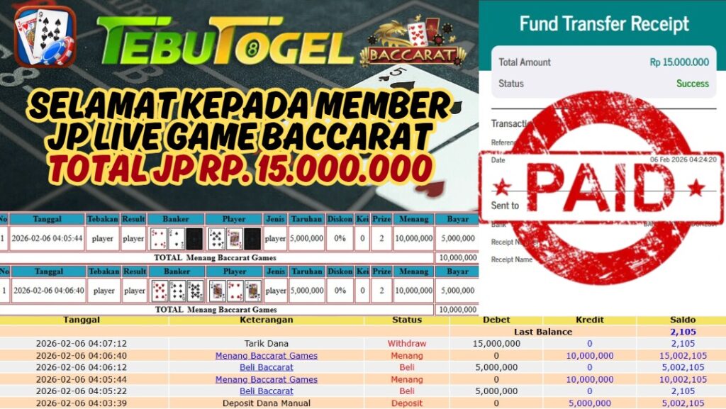 Selamat kepada User id : CAPRICORN** telah berhasil mendapatkan kemenangan besar pada permainan LIVE GAME BACCARAT  dengan kemenangan sebesar Rp 15.000.000,- Setelah mengisi formulir withdraw dengan kurung waktu hanya 5 – 10 menit pihak TebuTogel sudah melakukan transfer kepada pemilik User id dan dana sudah dapat dicairkan oleh pemenang. Bukti pembayaran yang kami berikan merupakan bukti pembayaran yang SAH / VALID yang langung didapatkan melalui tanda transfer transaksi dari Bank yang dituju.