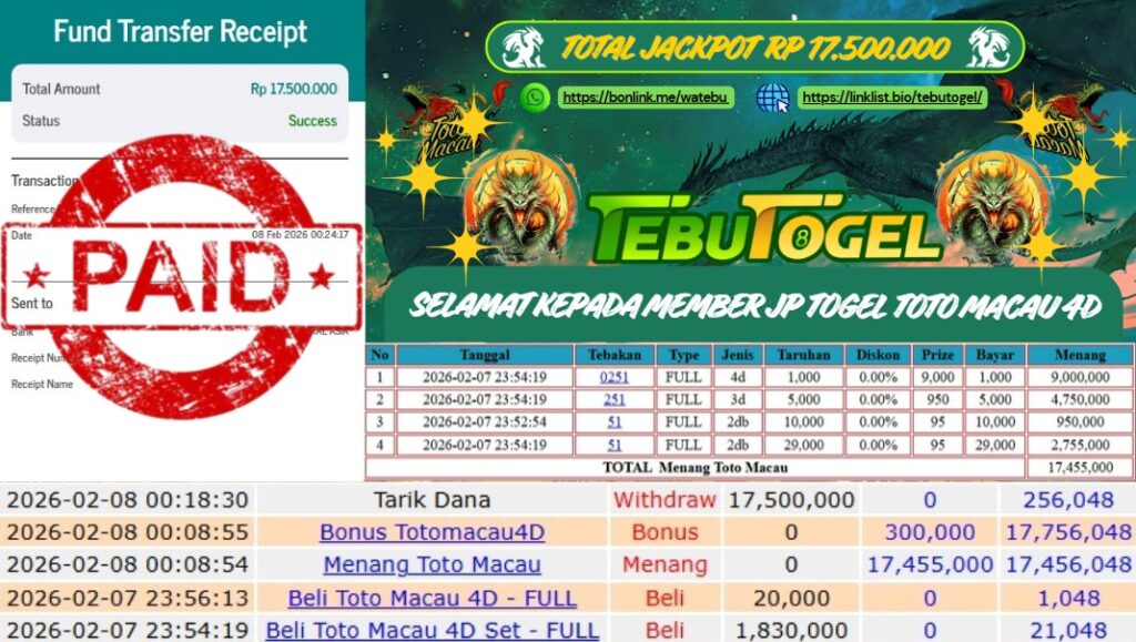 Selamat kepada User id : CAPO*** telah berhasil mendapatkan kemenangan besar pada permainan TOGEL TOTO MACAU 4D dengan kemenangan … Baca selengkapnya...
