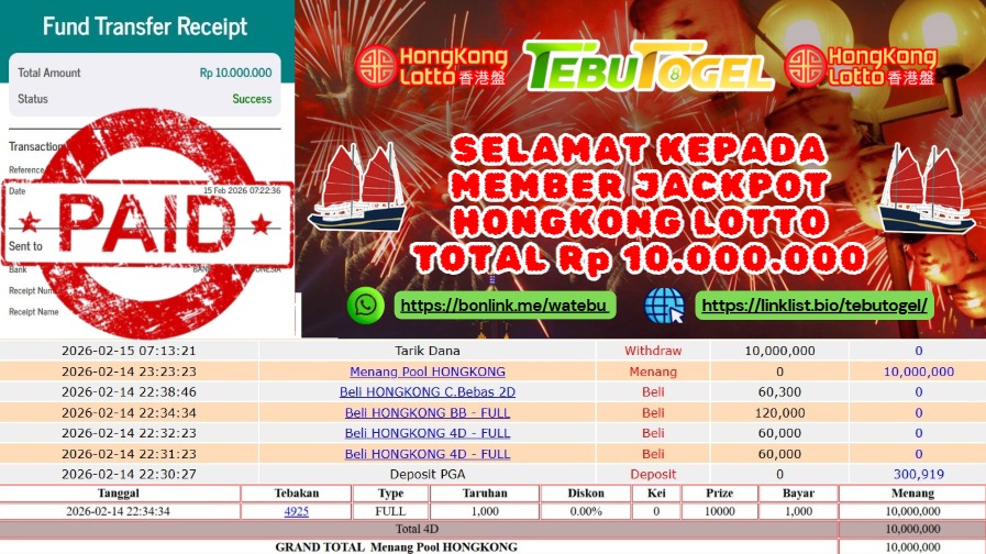 Selamat kepada User id : TRIV*** telah berhasil mendapatkan kemenangan besar pada permainan TOGEL HONGKONG LOTTO dengan kemenangan sebesar Rp 10.000.000,- Setelah mengisi formulir withdraw dengan kurung waktu hanya 5 – 10 menit pihak TebuTogel sudah melakukan transfer kepada pemilik User id dan dana sudah dapat dicairkan oleh pemenang. Bukti pembayaran yang kami berikan merupakan bukti pembayaran yang SAH / VALID yang langung didapatkan melalui tanda transfer transaksi dari Bank yang dituju.