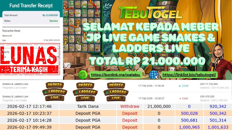 Selamat kepada User id : YUMI*** telah berhasil mendapatkan kemenangan besar pada permainan LIVE GAME SNAKES & LADDERS dengan kemenangan sebesar Rp 21.00.000,- Setelah mengisi formulir withdraw dengan kurung waktu hanya 5 – 10 menit pihak TebuTogel sudah melakukan transfer kepada pemilik User id dan dana sudah dapat dicairkan oleh pemenang. Bukti pembayaran yang kami berikan merupakan bukti pembayaran yang SAH / VALID yang langung didapatkan melalui tanda transfer transaksi dari Bank yang dituju.