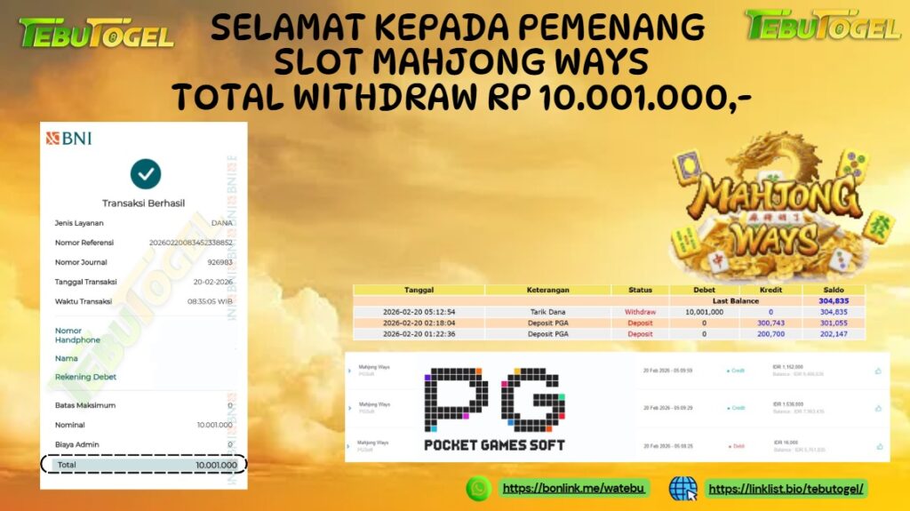 Selamat kepada User id : GIBRA** telah berhasil mendapatkan kemenangan besar pada permainan SLOT MAHJONG WAYS   dengan kemenangan sebesar Rp 10.001.000- Setelah mengisi formulir withdraw dengan kurung waktu hanya 5 – 10 menit pihak TebuTogel sudah melakukan transfer kepada pemilik User id dan dana sudah dapat dicairkan oleh pemenang. Bukti pembayaran yang kami berikan merupakan bukti pembayaran yang SAH / VALID yang langung didapatkan melalui tanda transfer transaksi dari Bank yang dituju.