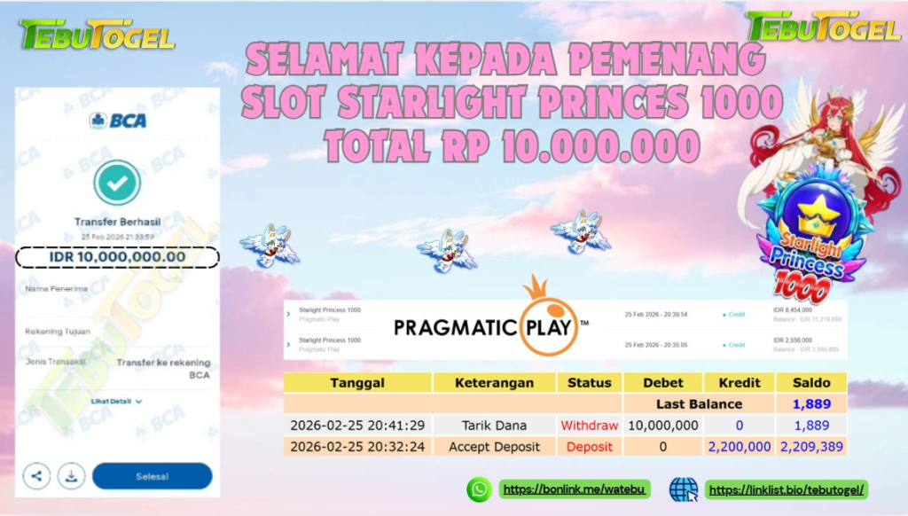 Selamat kepada User id : ZIDA** telah berhasil mendapatkan kemenangan besar pada permainan SLOT STARLIGHT PRINCES 1000 dengan kemenangan sebesar Rp 10.000.000,- Setelah mengisi formulir withdraw dengan kurung waktu hanya 5 – 10 menit pihak TebuTogel sudah melakukan transfer kepada pemilik User id dan dana sudah dapat dicairkan oleh pemenang. Bukti pembayaran yang kami berikan merupakan bukti pembayaran yang SAH / VALID yang langung didapatkan melalui tanda transfer transaksi dari Bank yang dituju.