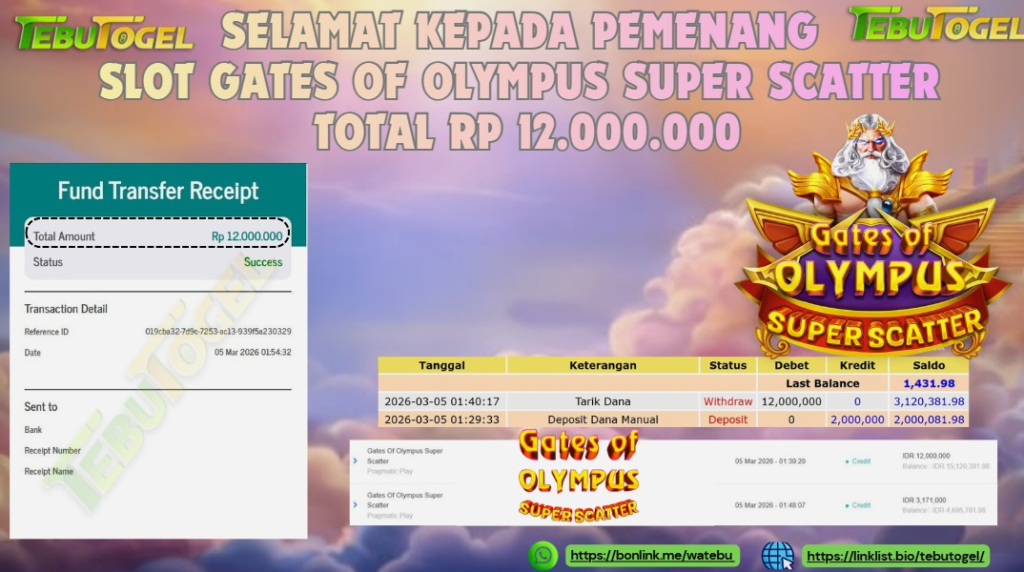 Selamat kepada User id : GEYA** telah berhasil mendapatkan kemenangan besar pada permainan SLOT GATES OF OLYMPUS SUPER SCATTER dengan kemenangan sebesar Rp 12.000.000,- Setelah mengisi formulir withdraw dengan kurung waktu hanya 5 – 10 menit pihak TebuTogel sudah melakukan transfer kepada pemilik User id dan dana sudah dapat dicairkan oleh pemenang. Bukti pembayaran yang kami berikan merupakan bukti pembayaran yang SAH / VALID yang langung didapatkan melalui tanda transfer transaksi dari Bank yang dituju.