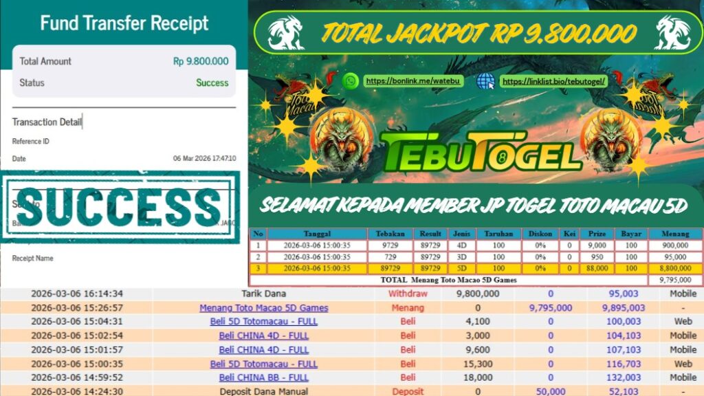 Selamat kepada User id : DAK** telah berhasil mendapatkan kemenangan besar pada permainan TOGEL TOTO MACAU 5D dengan kemenangan sebesar … Baca selengkapnya...