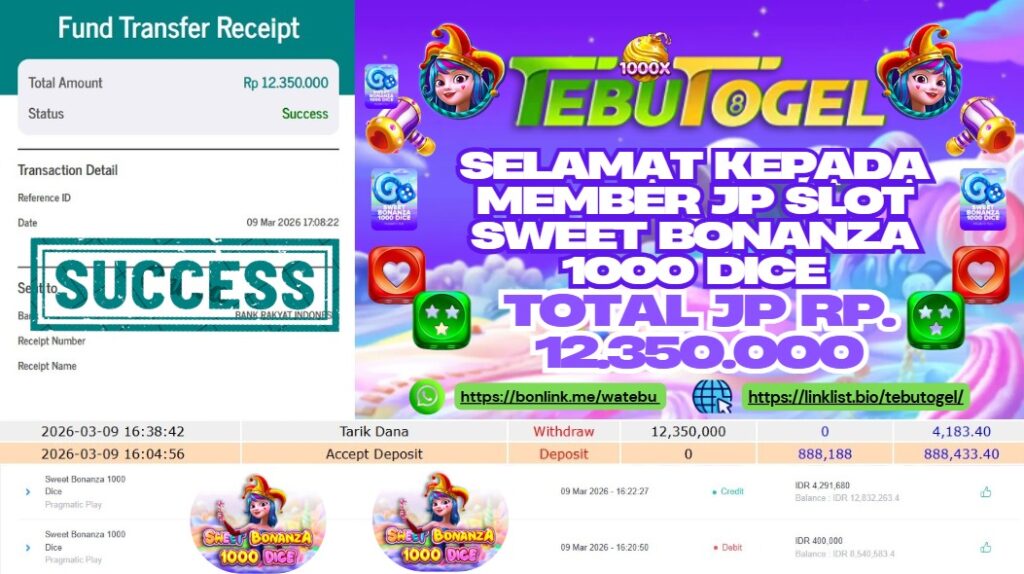 Selamat kepada User id : SONIA** telah berhasil mendapatkan kemenangan besar pada permainan SLOT SWEET BONANZA 1000 DICE dengan kemenangan sebesar Rp 10.000.000,- Setelah mengisi formulir withdraw dengan kurung waktu hanya 5 – 10 menit pihak TebuTogel sudah melakukan transfer kepada pemilik User id dan dana sudah dapat dicairkan oleh pemenang. Bukti pembayaran yang kami berikan merupakan bukti pembayaran yang SAH / VALID yang langung didapatkan melalui tanda transfer transaksi dari Bank yang dituju.