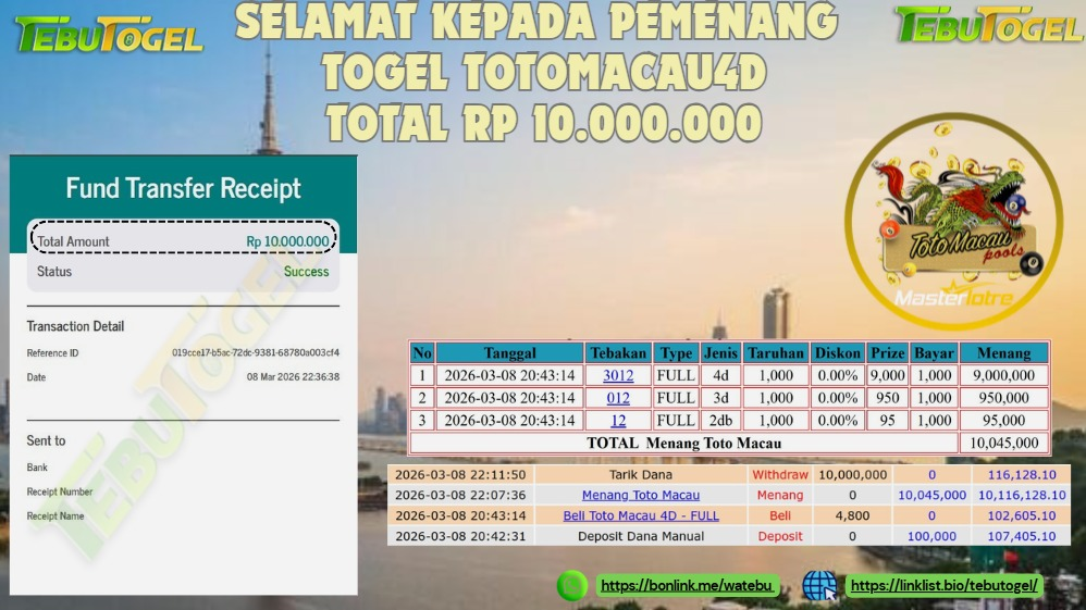 Selamat kepada User id : ANDR** telah berhasil mendapatkan kemenangan besar pada permainan TOGEL TOTO MACAU 4D dengan kemenangan sebesar Rp 10.000.000,- Setelah mengisi formulir withdraw dengan kurung waktu hanya 5 – 10 menit pihak TebuTogel sudah melakukan transfer kepada pemilik User id dan dana sudah dapat dicairkan oleh pemenang. Bukti pembayaran yang kami berikan merupakan bukti pembayaran yang SAH / VALID yang langung didapatkan melalui tanda transfer transaksi dari Bank yang dituju.