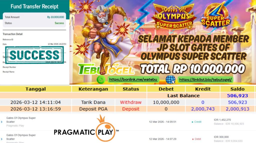 Selamat kepada User id : SAKI** telah berhasil mendapatkan kemenangan besar pada permainan SLOT GATES OF OLYMPUS SUPER SCATTER dengan kemenangan sebesar Rp 10.000.000,- Setelah mengisi formulir withdraw dengan kurung waktu hanya 5 – 10 menit pihak TebuTogel sudah melakukan transfer kepada pemilik User id dan dana sudah dapat dicairkan oleh pemenang. Bukti pembayaran yang kami berikan merupakan bukti pembayaran yang SAH / VALID yang langung didapatkan melalui tanda transfer transaksi dari Bank yang dituju.