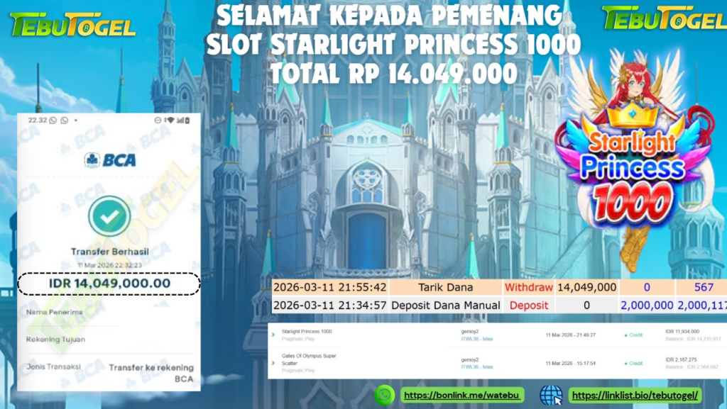 Selamat kepada User id : blue** telah berhasil mendapatkan kemenangan besar pada permainan SLOT STARLIGHT PRINCESS 1000 dengan kemenangan sebesar Rp 14.049.000,- Setelah mengisi formulir withdraw dengan kurung waktu hanya 5 – 10 menit pihak TebuTogel sudah melakukan transfer kepada pemilik User id dan dana sudah dapat dicairkan oleh pemenang. Bukti pembayaran yang kami berikan merupakan bukti pembayaran yang SAH / VALID yang langung didapatkan melalui tanda transfer transaksi dari Bank yang dituju.
