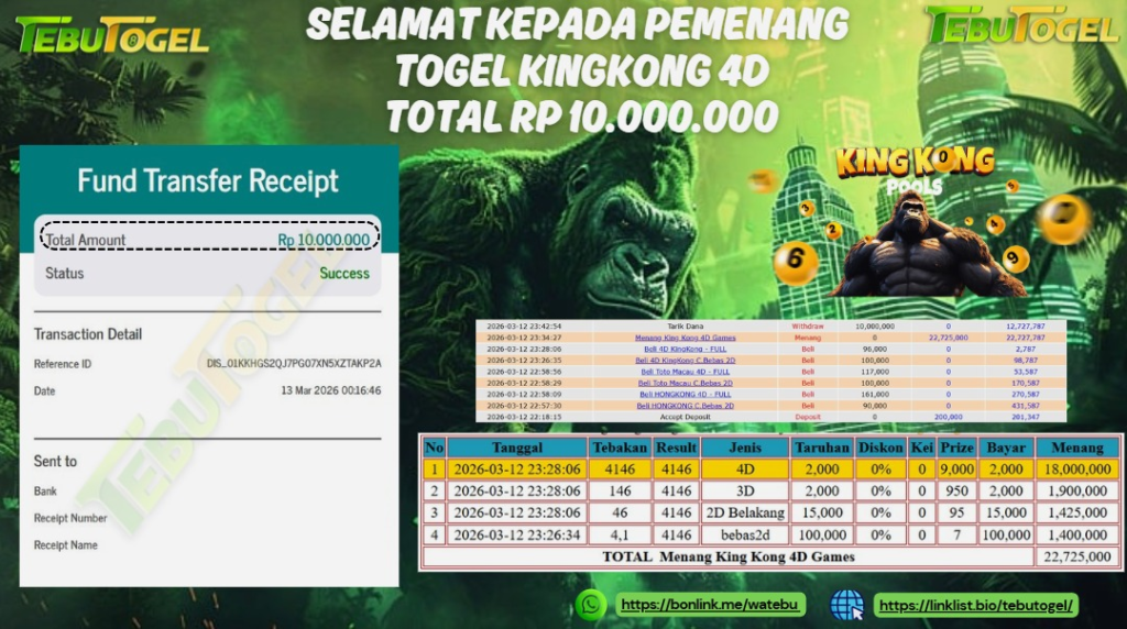 Selamat kepada User id : DIMAS** telah berhasil mendapatkan kemenangan besar pada permainan TOGEL KINGKONG 4D dengan kemenangan sebesar Rp 10.000.000,- Setelah mengisi formulir withdraw dengan kurung waktu hanya 5 – 10 menit pihak TebuTogel sudah melakukan transfer kepada pemilik User id dan dana sudah dapat dicairkan oleh pemenang. Bukti pembayaran yang kami berikan merupakan bukti pembayaran yang SAH / VALID yang langung didapatkan melalui tanda transfer transaksi dari Bank yang dituju.