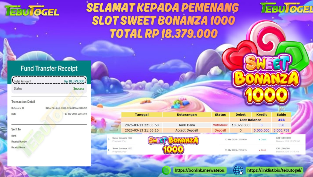Selamat kepada User id : karen** telah berhasil mendapatkan kemenangan besar pada permainan SLOT SWEET BONANZA 1000 dengan kemenangan sebesar Rp 18.379.000,- Setelah mengisi formulir withdraw dengan kurung waktu hanya 5 – 10 menit pihak TebuTogel sudah melakukan transfer kepada pemilik User id dan dana sudah dapat dicairkan oleh pemenang. Bukti pembayaran yang kami berikan merupakan bukti pembayaran yang SAH / VALID yang langung didapatkan melalui tanda transfer transaksi dari Bank yang dituju.