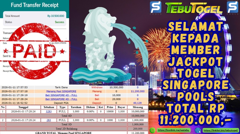 BUKTI JACKPOT TOGEL SINGAPORE POOLS Rp 11.200.000,- LUNAS