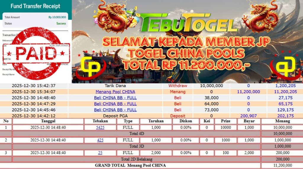 Selamat kepada User id : MIYA**** telah berhasil mendapatkan kemenangan besar pada permainan TOGEL CHINA POOLS dengan kemenangan sebesar Rp … Baca selengkapnya...