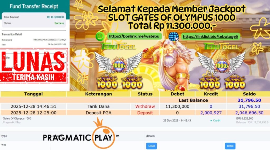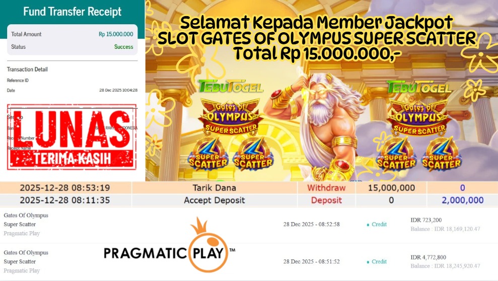 Selamat kepada User id : KOCAKKKS** telah berhasil mendapatkan kemenangan besar pada permainan SLOT GATES OF OLYMUS SUPER SCATTER dengan … Baca selengkapnya...