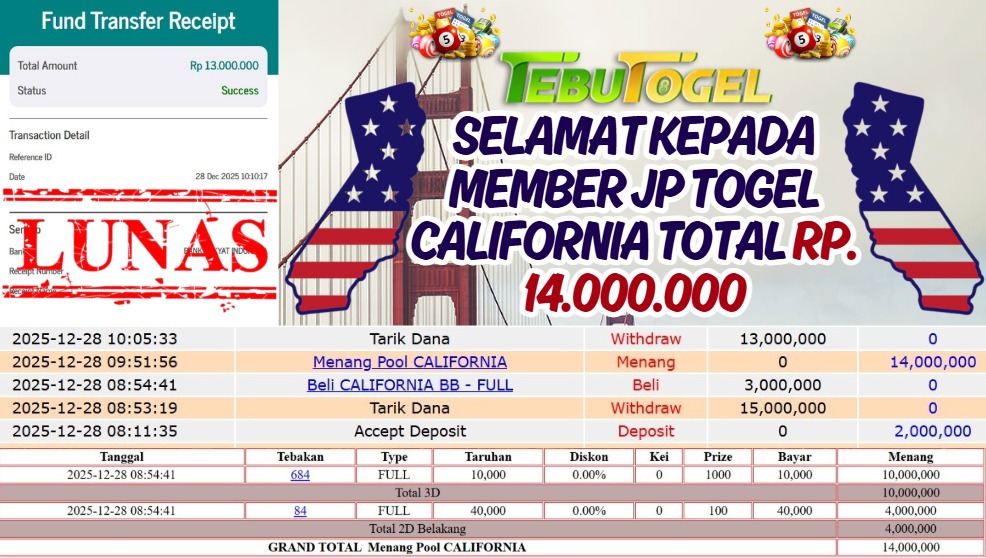 Selamat kepada User id : RONALD** telah berhasil mendapatkan kemenangan besar pada permainan TOGEL CALIFORNIA dengan kemenangan sebesar Rp 14.000.000,-… Baca selengkapnya...