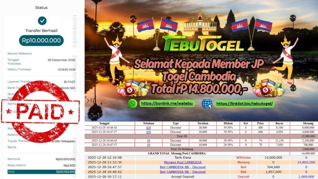 Selamat kepada User id : CLINT** telah berhasil mendapatkan kemenangan besar pada permainan TOGEL CAMBODIA dengan kemenangan sebesar Rp … Baca selengkapnya...