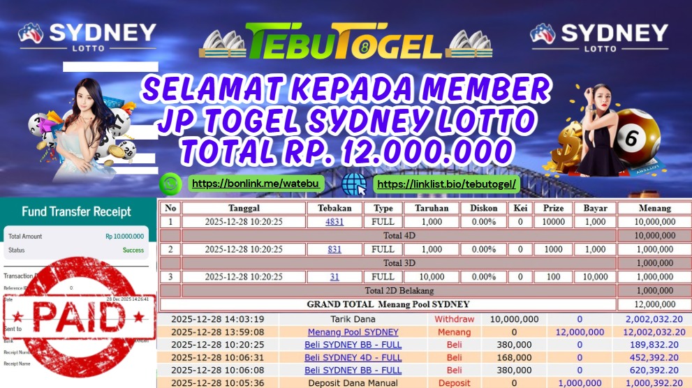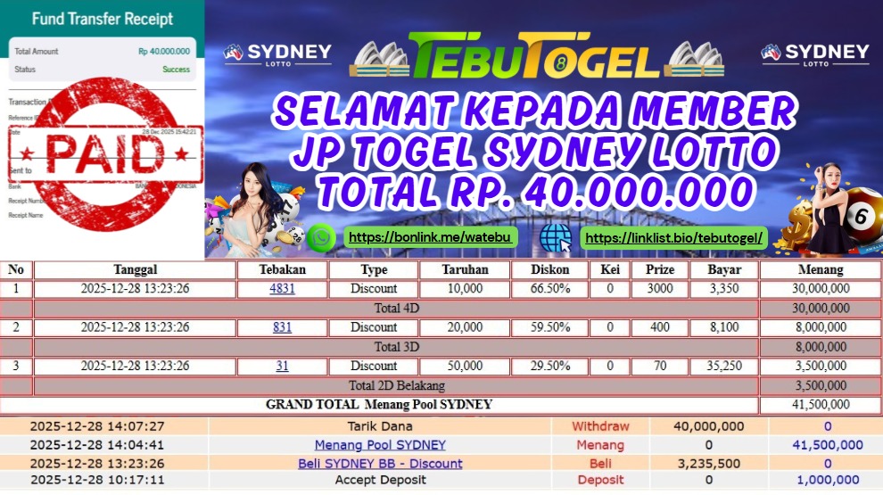 Selamat kepada User id : JGNA** telah berhasil mendapatkan kemenangan besar pada permainan TOGEL SYDNEY LOTTO dengan kemenangan sebesar Rp … Baca selengkapnya...
