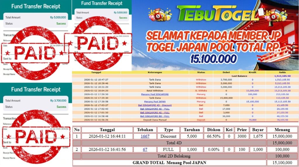 Selamat kepada User id : ROH** telah berhasil mendapatkan kemenangan besar pada permainan TOGEL JAPAN POOL dengan kemenangan sebesar Rp … Baca selengkapnya...